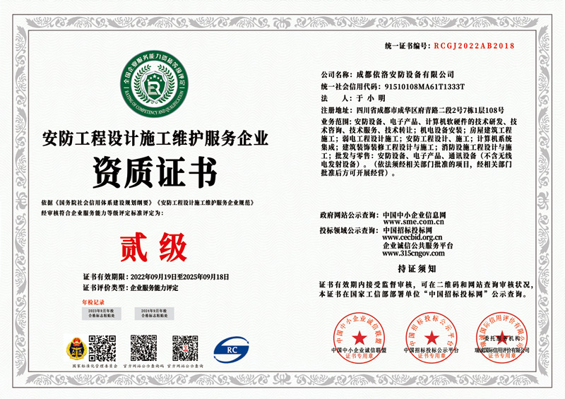 成都監(jiān)控安裝公司 之 安防工程設(shè)計(jì)施工維護(hù)資質(zhì)證書(貳級(jí))